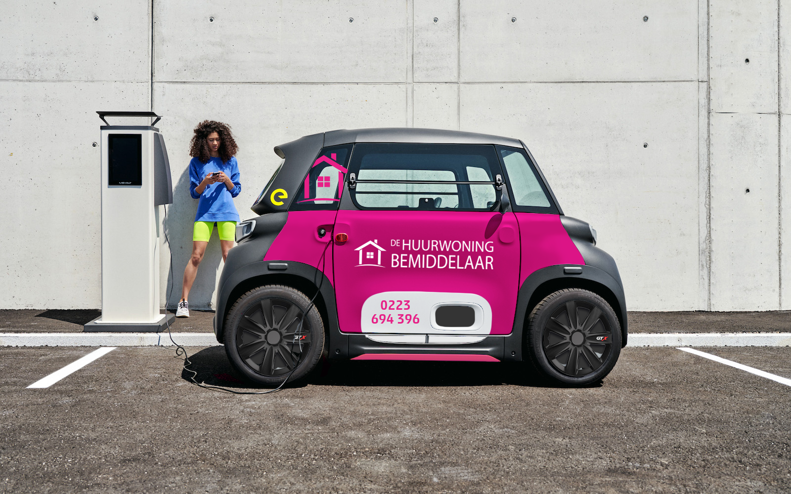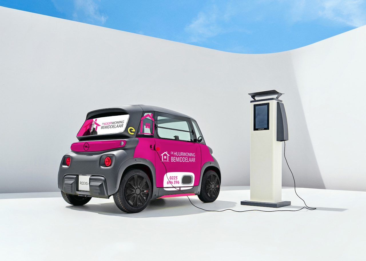 Ontwerp van autoreclame voor een Opel Rocks E en visitekaartjes.