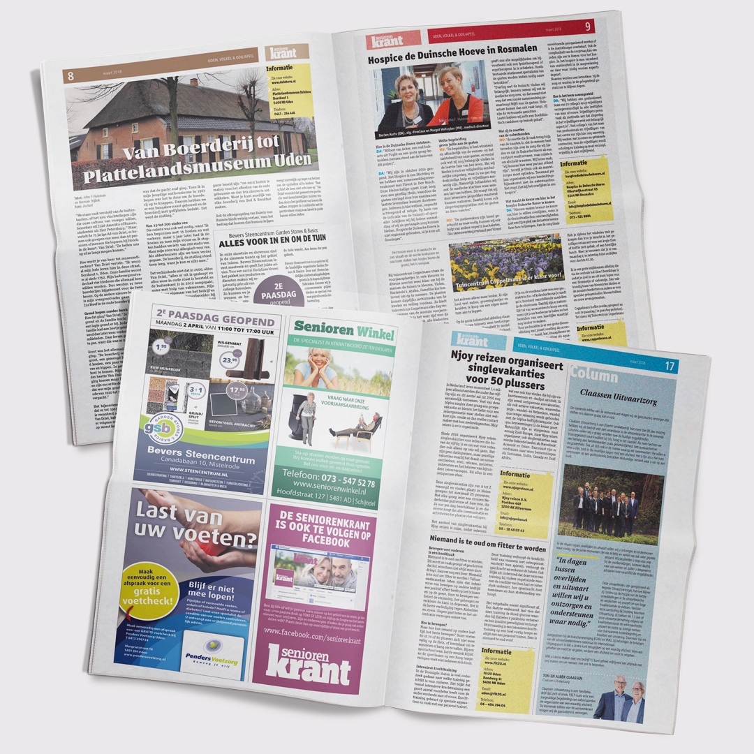 Opmaak Seniorenkrant Uden. De Seniorenkrant verschijnt 4 maal per jaar in Den Helder/Julianadorp, Schagen/Hollands Kroon, Heerhugowaard, Uden/Volkel/Odiliapeel en Oss.